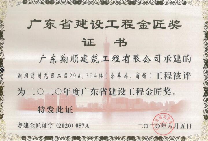 翔顺筠州酒店获得2020年度广东省建设工程金匠奖