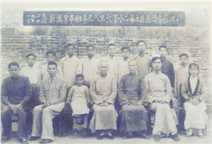 温北英(时年8岁 左三)与父亲温德甫(时任新兴县第四区区立第二小学的校长 左四)及其学校师生一行人合影