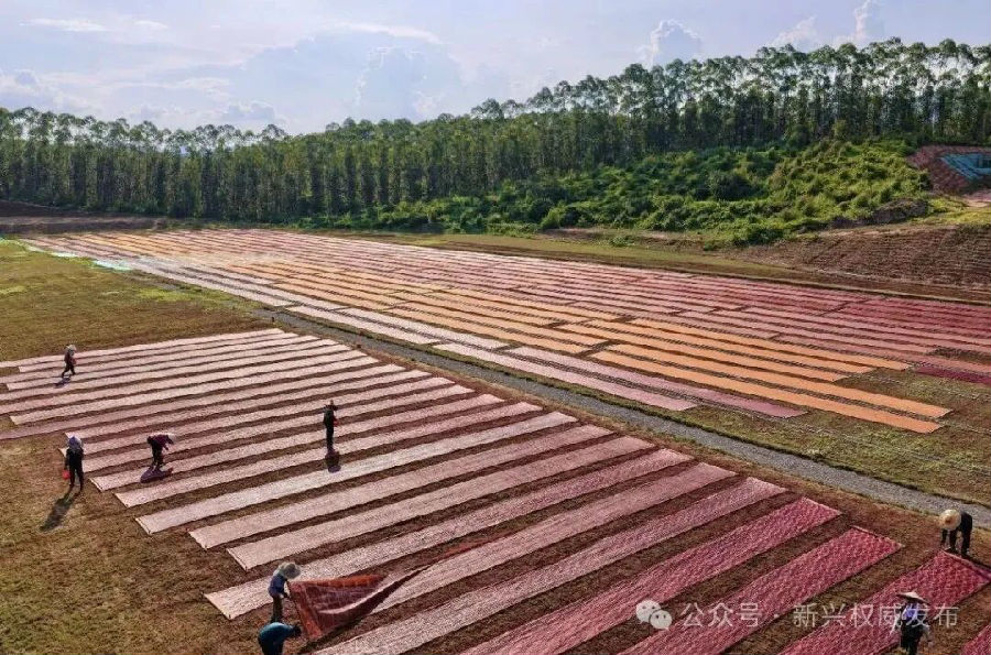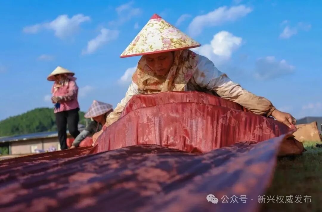 晨光穿透薄雾洒在云浮市新兴县水台镇大地上,数十匹浸染薯莨汁的香云纱正在草坪上铺展,宛如流动的亮褐色河流。村民梁伯手持蒲葵叶扫帚,将吸吮了淋漓莨汁的胚绸上的气泡一一扫却,动作娴熟如抚琴弦,“这片晒场两年前还是荒废的山地,如今成了‘丝绸软黄金’的摇篮”。
