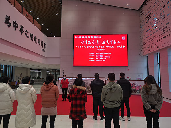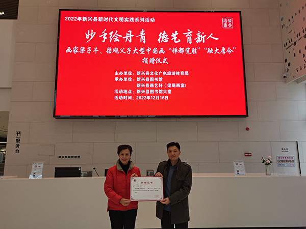 2022年12月16日妙手绘丹青,德艺育新人画家梁子牛,梁飚父子大型中国画“禅都览胜”“融大厚今”捐赠仪式 (县图书馆大堂)