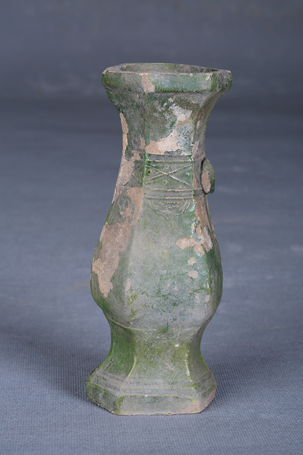 明绿釉印花双耳六角瓶