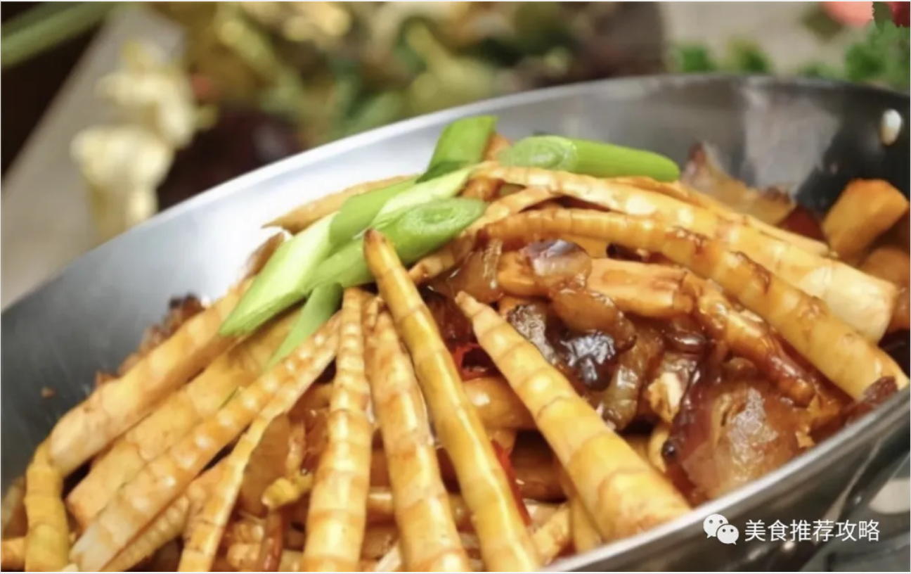 郁南笋竹,又称甜笋,是广东云浮郁南县的一种特产。当地人喜欢用笋竹烧肉,制作工艺也非常讲究,主要以笋竹和五花肉为原料,制作时先将五花肉切片,笋竹洗净待用,然后起锅下油烧肉,把切好的五花肉下锅煎出油,再下一些其他调味品混合炒香,最后下入笋竹加入食用盐翻炒均匀即可。成菜具有口感爽脆,味道清香,营养丰富等特点,是当地民众非常喜爱的一种菜肴。