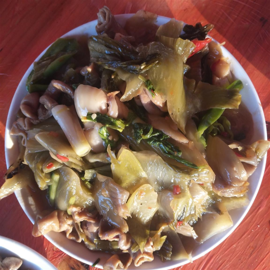 酸菜,在天堂镇也是一道传统吉祥菜式,在天堂方言中,“酸”与“孙”谐音,“菜”与“财”谐音,所以酸菜寓意着子孙满堂、财源滚滚的意思。